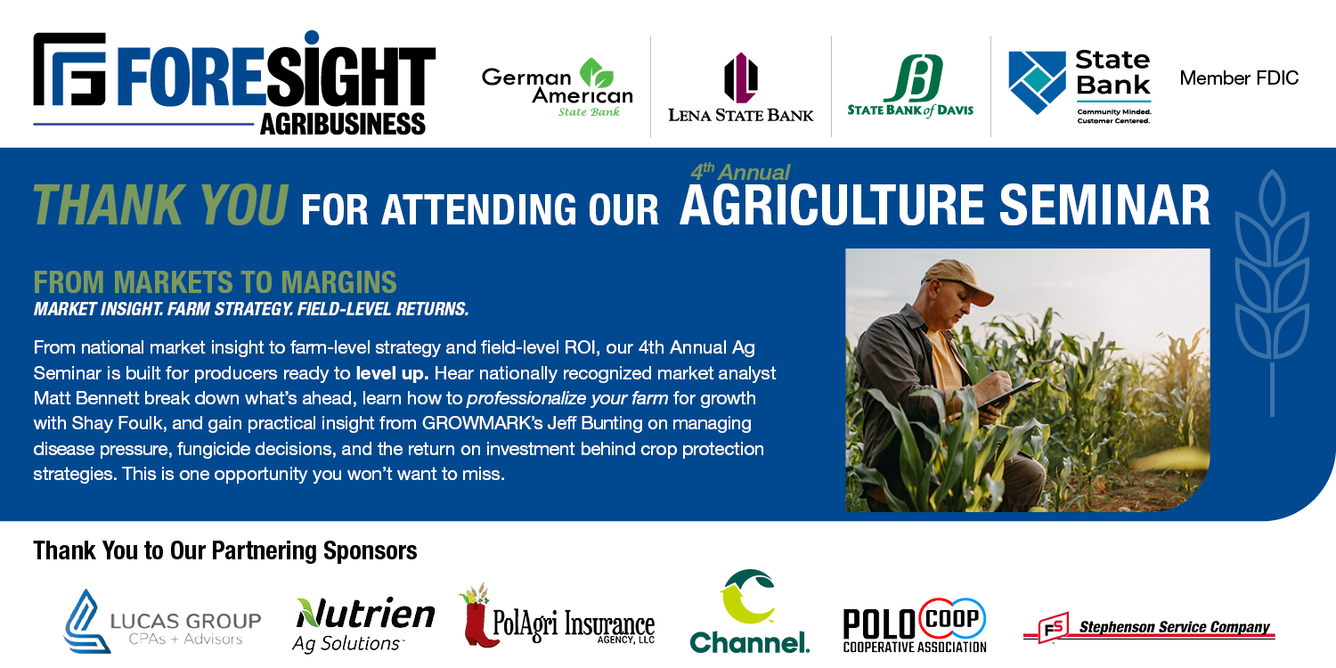 Seventh-generation Illinois farmer and nationally recognized ag market analyst. Matt brings real-time insight on grain markets, risk, and what’s ahead.